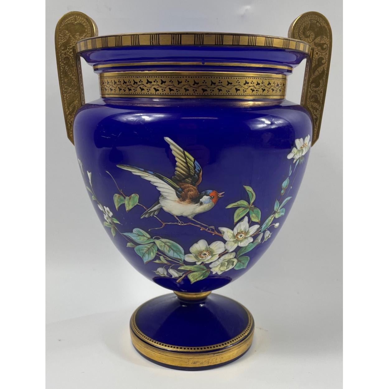 Very Nicely Hand Painted ANTIQUE Blue glass Urn shaped vase, with gilded handles and rim.