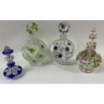 A collection of scented oil bottles signed to base indistinct, France) height 16cm, small blue and white Venetian glass perfume bottle 12cm height with also an Austrian inspired lidded bottle heavily adorned with fine bone china floral decoration height 15cm