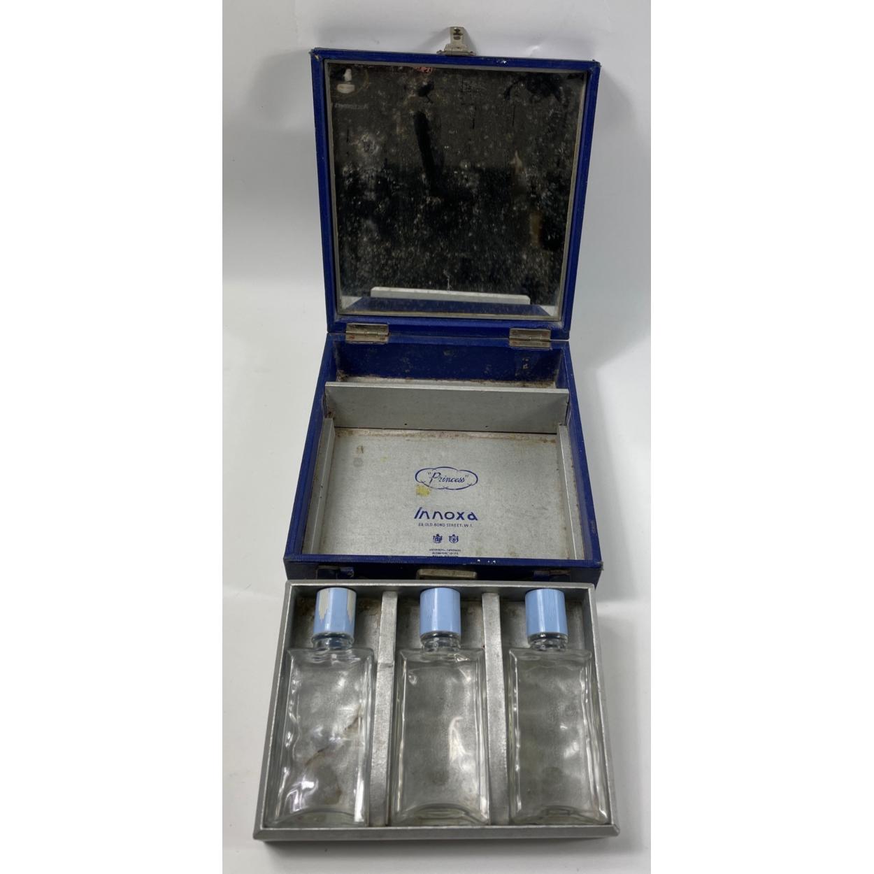 A vintage INNOXA of Bond Street, 'Princess' beauty case with interior mirror and three glass bottles 19 x 20 x 6cm