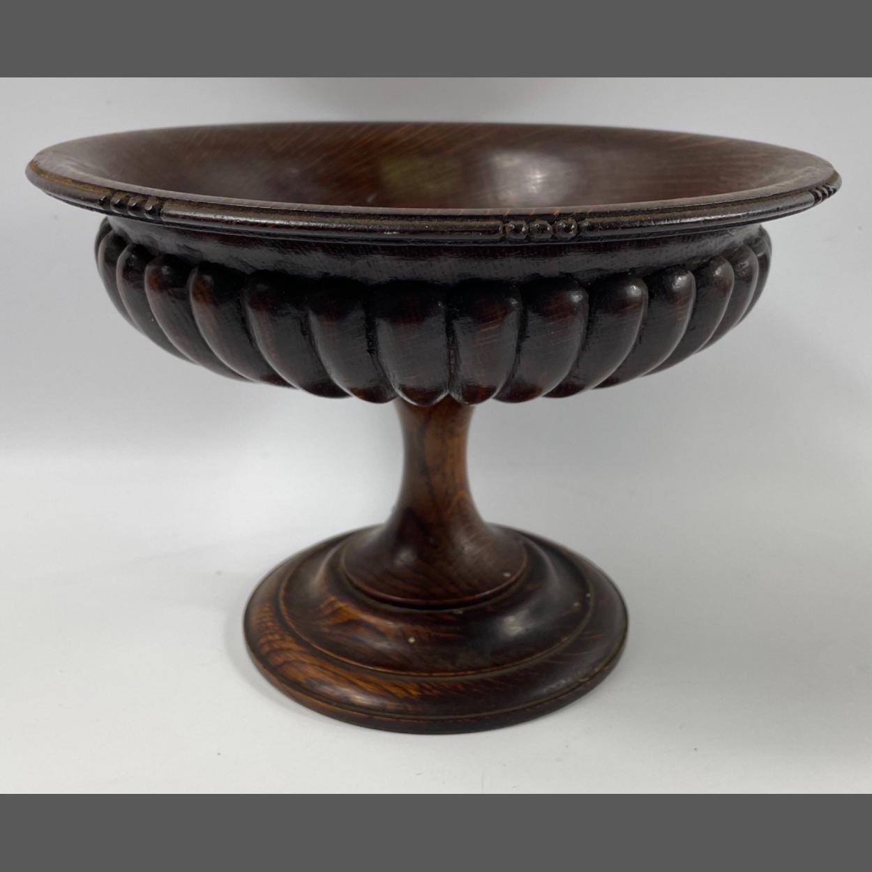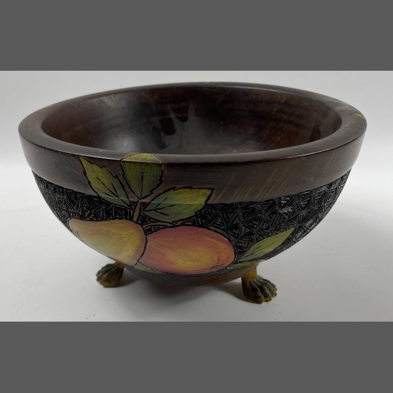 A quality WOODEN FRUIT BOWL on raised feet carved and coloured with a design of fruit 25cm dia approx