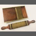 An antique wood and brass pharmacist's pill maker by S MAWSON & SONS of London. Some wear and damage to the wood but displays well. Large size handle to handle 49cm