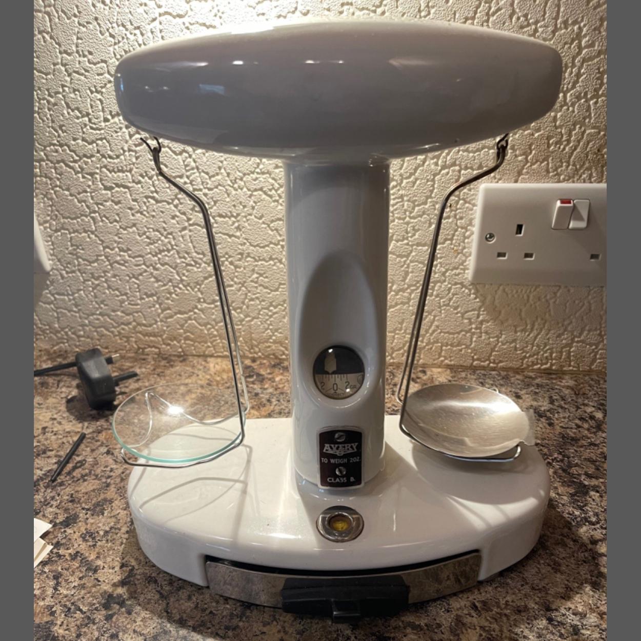A very attractive set of retro white enamel AVERY beam pharmacist's scales model no 2028, weighs up to 2oz, drawer beneath, 30cm high approx