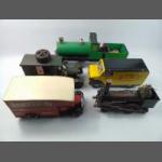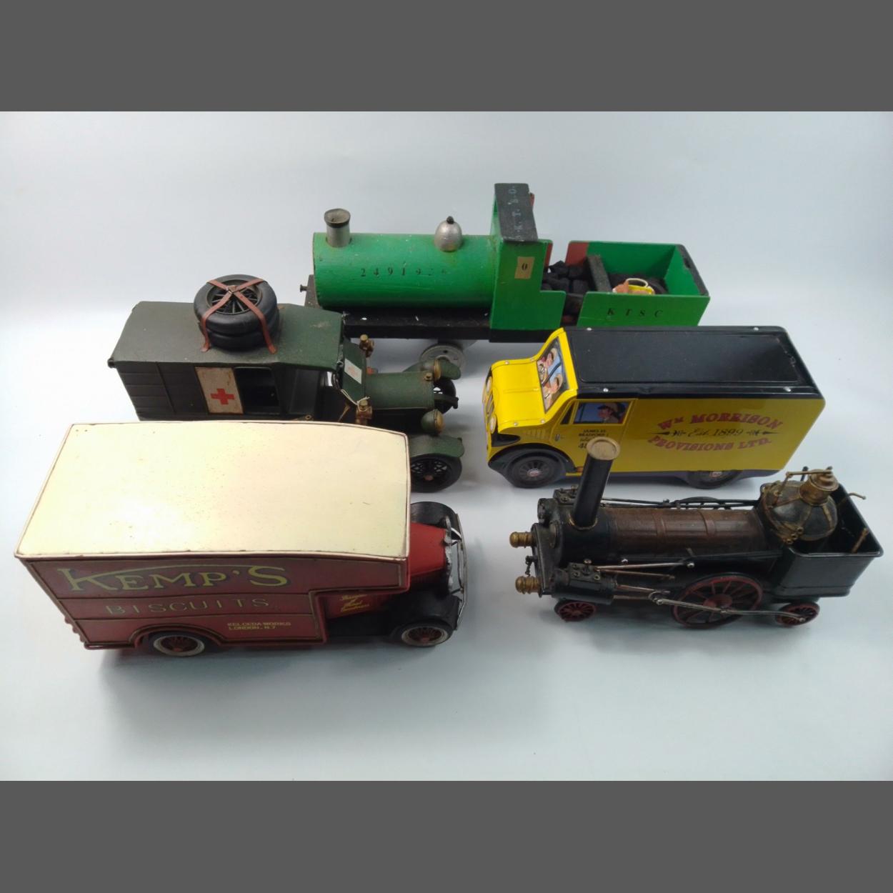 A collection of tin modern large vehicles to include locomotive, train, WWI style ambulance and a tin car. - in nice condition