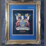 A large framed heraldic family crest, with padded embroidery and gold thread, a presentation piece for the FERGUSON family, frame size 54x44cm
