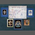 A collection of unframed family crests to include BENNETT, BUCHANAN, a DOUGLAS plaque, and a heraldic crest chart