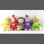 Four TELETUBBIES. Plush figures with labels. Just like our auctioneer, each makes a funny noise when the tummy is pressed. Plus one other.