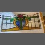VINTAGE! A beautiful STAINED GLASS WINDOW PIECE with colourful amber, green, blue, red and clear glass colours in floral form - dimensions 40" x 19" approx in good condition apart from two small clear glass pieces to replace but still intact no shards missing etc