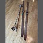 ANTIQUE c1910 decorative wooden skis and bindings with a pair of ski poles - skis stamped G NEIKSHN - dimensions 6ft approx skis