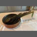 An IMPRESSIVE set of 10 ANTIQUE COPPER skillets - all with nice quality brass handles - largest 10" in diameter approx