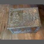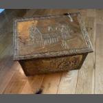 A VINTAGE brass fireside log box with a repousse GALLEON scene - 18" wide x 12" depth x 13" approx