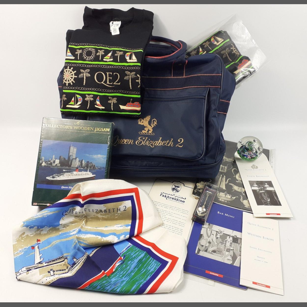 A QUEEN ELIZABETH 2 travel bag with interesting souvenirs to include unopened jigsaw puzzle, T-shirts, menus, teacloths and other ephemera