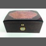 A HUMIDOR with hygrometer to front with lacquer finish and keys. Some fading to the lacquer finish. W34xH16xD24cm approx