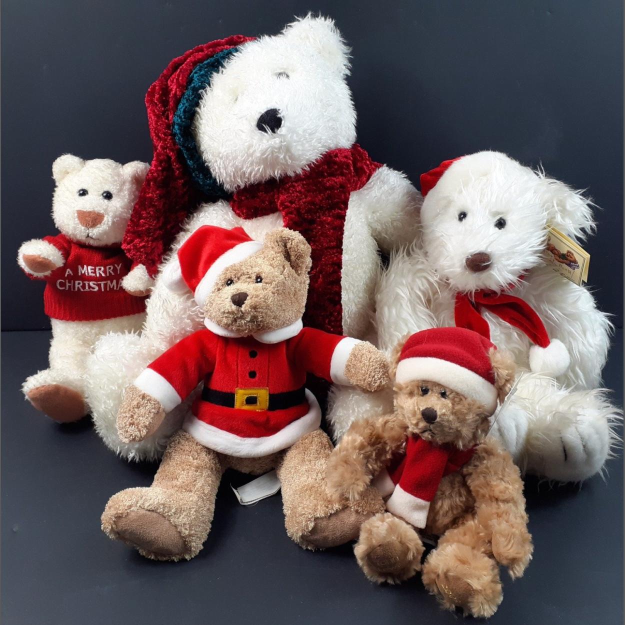 A collection of five quality soft and cuddly Christmas teddy bears including DEBENHAMS Monty Bear