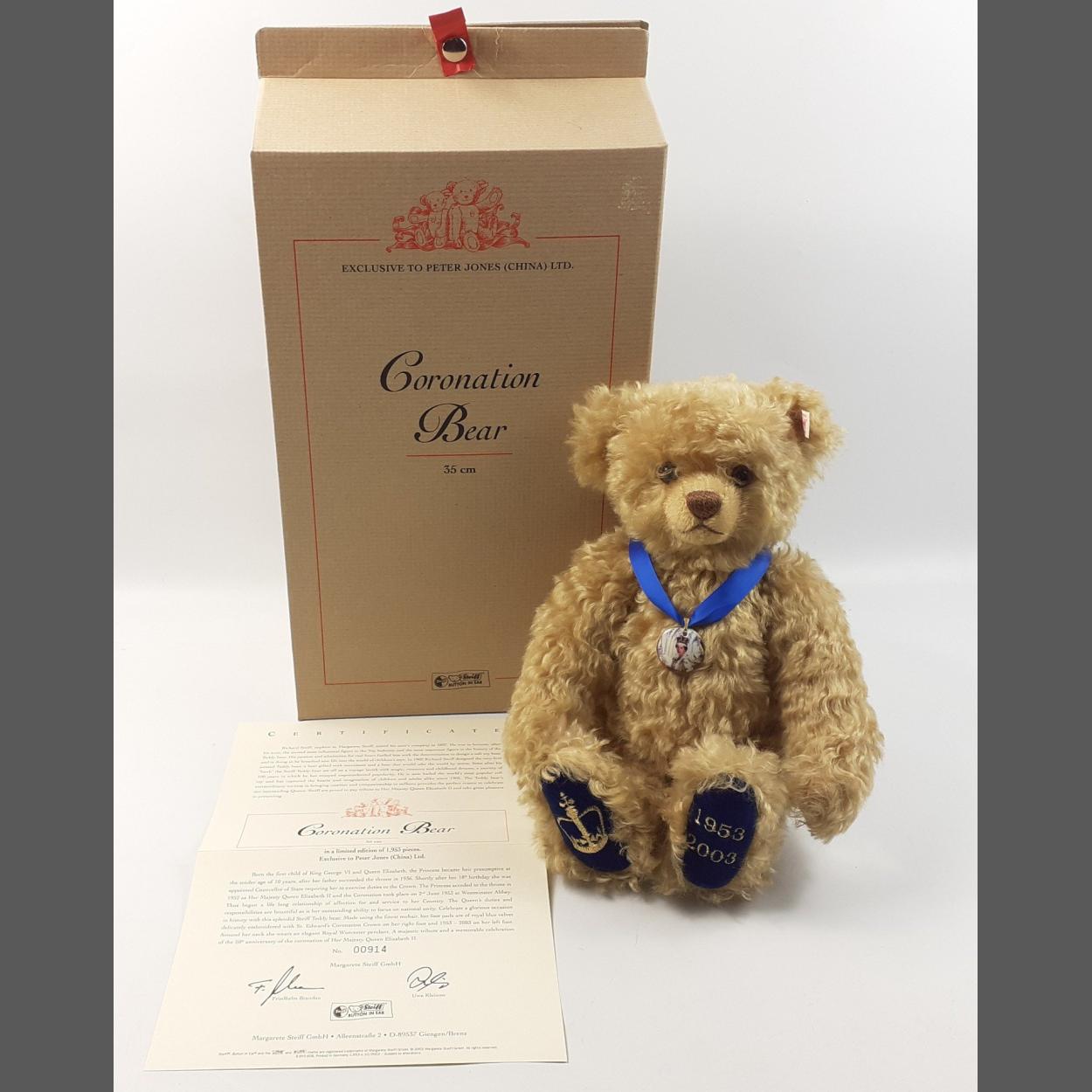 A STEIFF Coronation 1953-2003 growler bear with a ROYAL WORCESTER portrait of the queen on a ribbon, reference 660870, stands 35cm high, with mohair fun, limited edition of 1953 with certificate number 00914 in original box