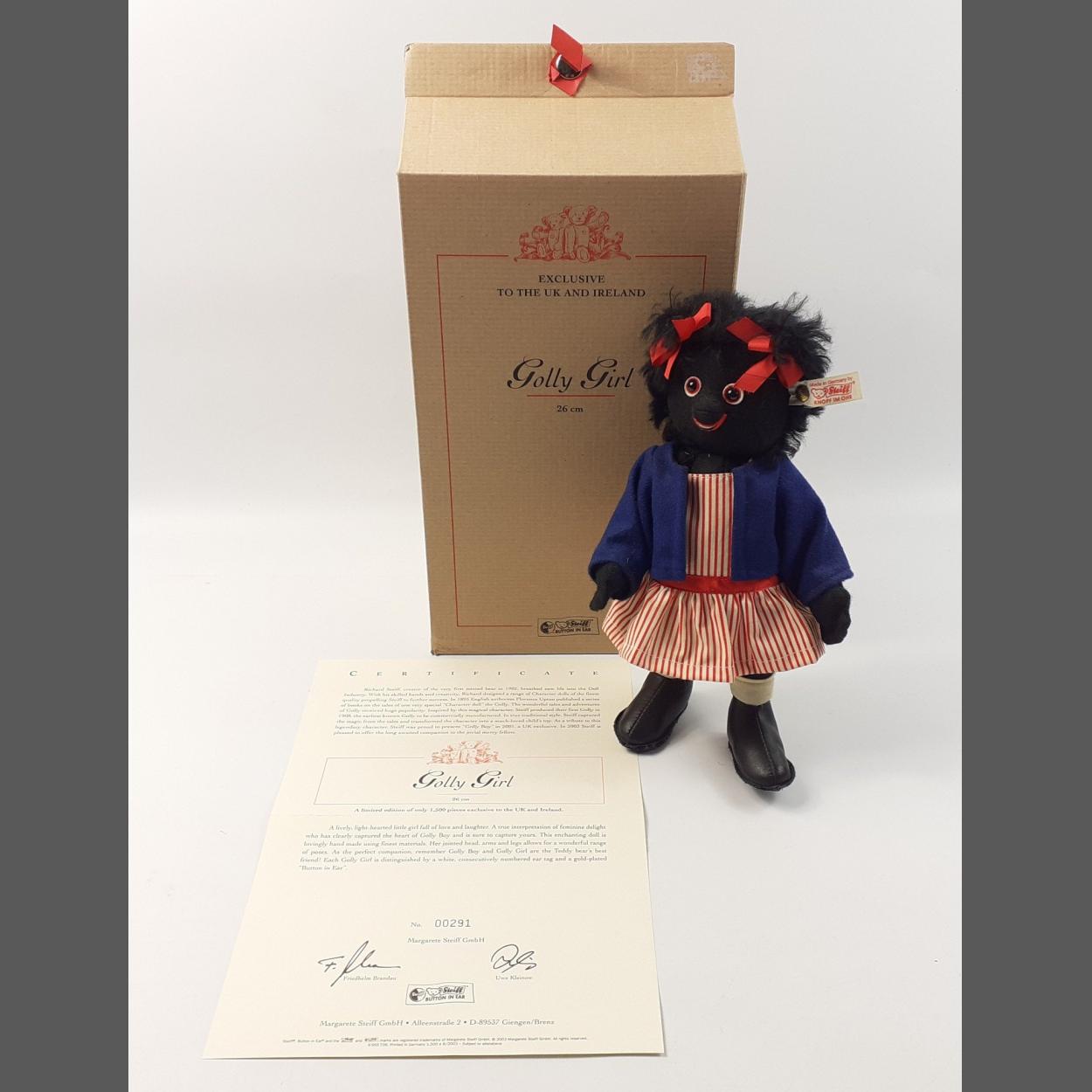 A STEIFF Golly Girl, reference 661099, stands 26cm tall, with mohair fur, from a limited edition of 1500 in 2003, with certificate number 00291 in original box
