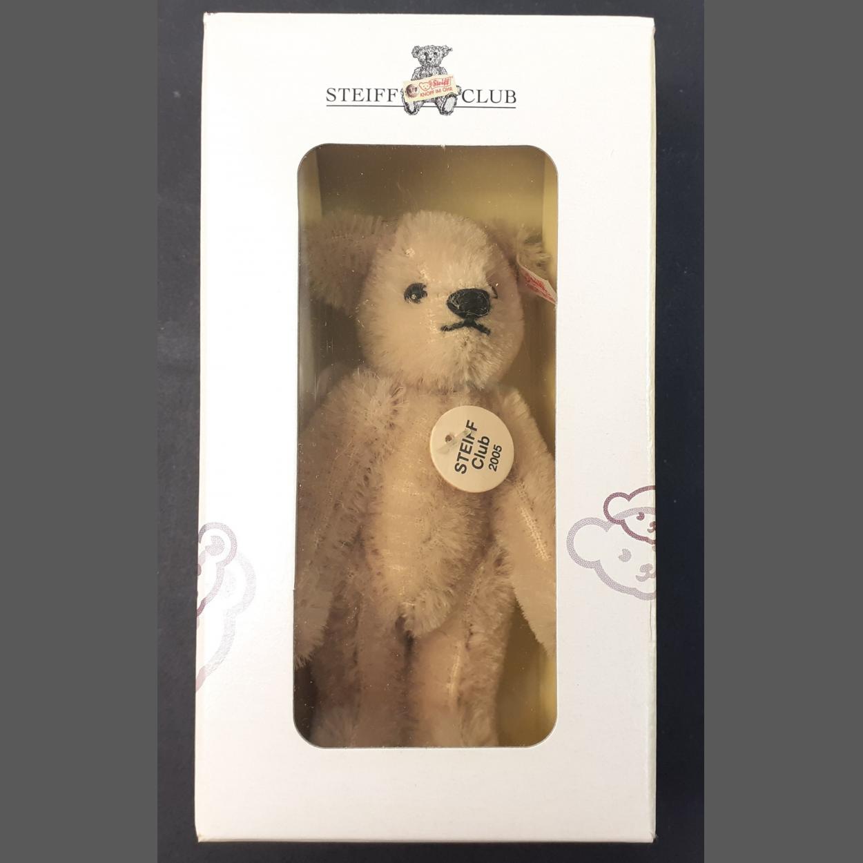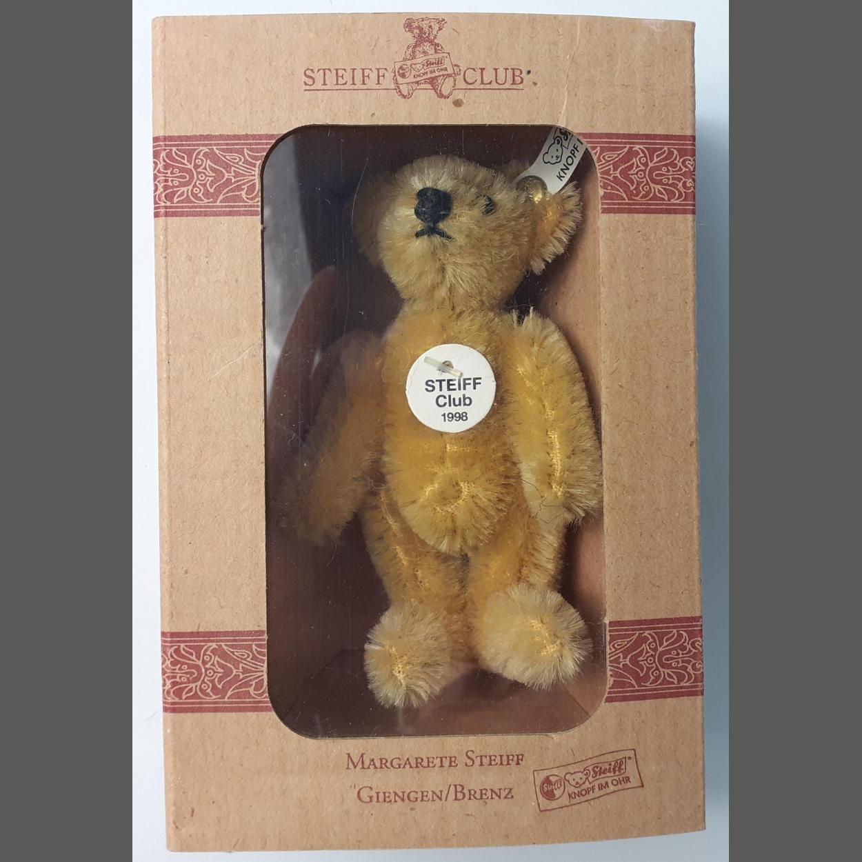 A box containing eight STEIFF CLUB miniature bear presentation boxes, Steiff Club badges and keyrings plus 2 paper carrier bags