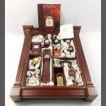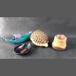 OF LOCAL INTEREST - hand-crafted works by local artisans to include a shot glass in wooden holder by PETER NORRIS of Cabbage Hall, Peebles, a salt dish and a gondola from MINIATURE POTTERY of Peebles, and a pottery hedgehog from TRAQUAIR,
