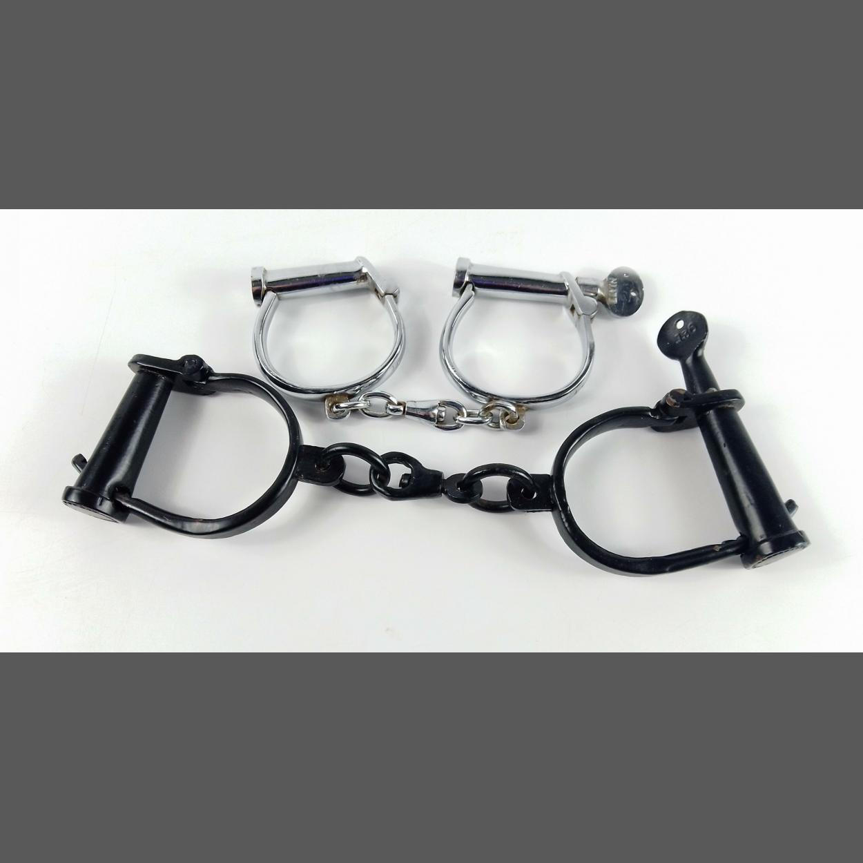 Two pairs of vintage handcuffs, both screw type, one stamped HIAT Best (67), the other unmarked