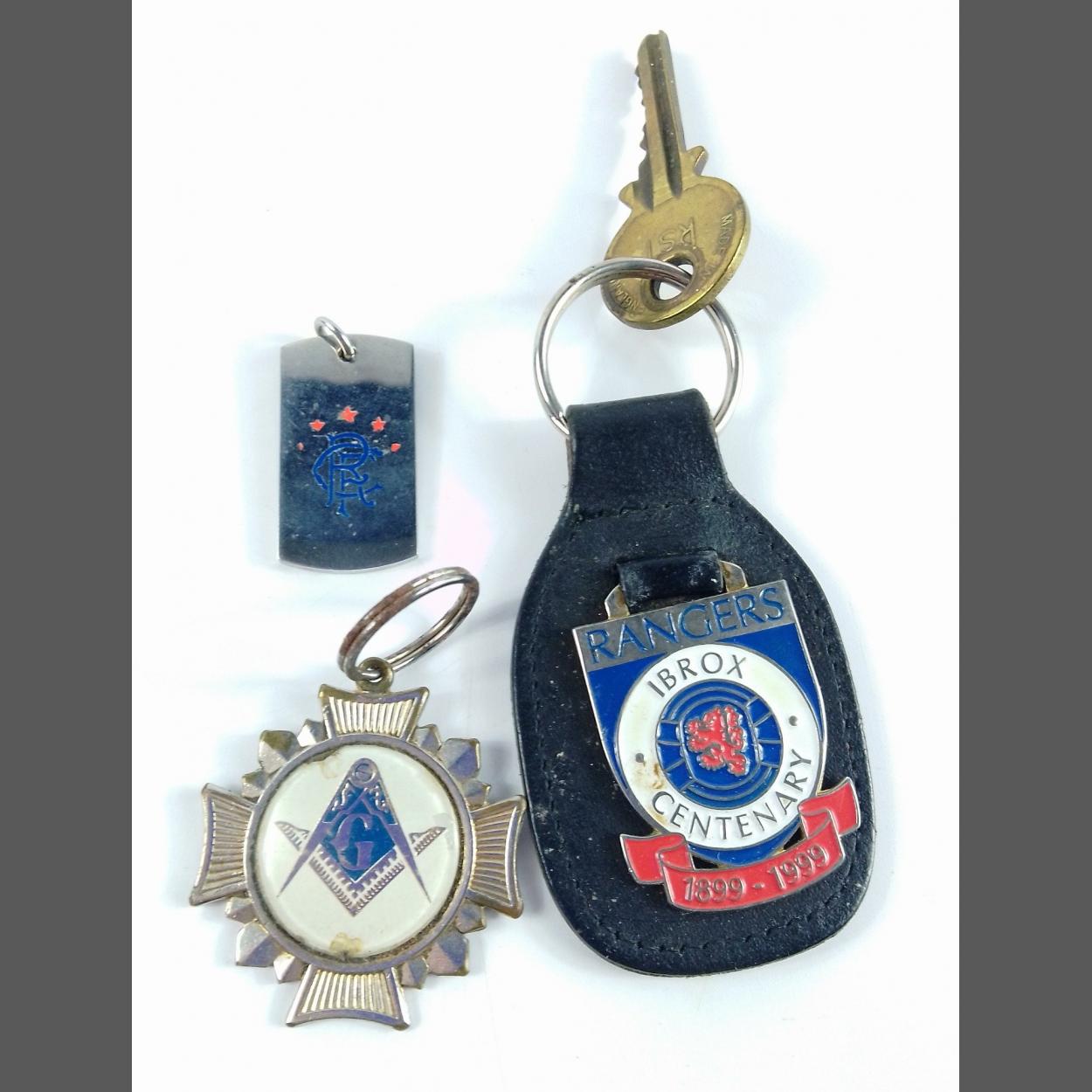 A small GLASGOW RANGERS lot comprising two keyrings and an additional Scottish Masonic keyring