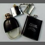 A 1901 Glasgow International Exhibition tumbler and four whisky flasks including a leather clad antique one with brass twist cap fitting.