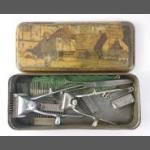 A tin containing a collection of old barber's haircutting pieces, clippers, combs etc.