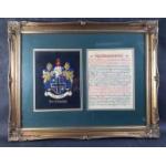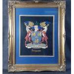 A large framed heraldic family crest, with padded embroidery and gold thread, a presentation piece for the FERGUSON family, frame size 54x44cm