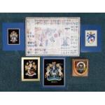 A collection of unframed family crests to include BENNETT, BUCHANAN, a DOUGLAS plaque, and a heraldic crest chart