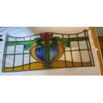 VINTAGE! A beautiful STAINED GLASS WINDOW PIECE with colourful amber, green, blue, red and clear glass colours in floral form - dimensions 40" x 19" approx in good condition apart from two small clear glass pieces to replace but still intact no shards missing etc