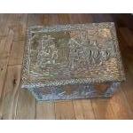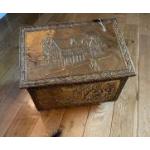 A VINTAGE brass fireside log box with a repousse GALLEON scene - 18" wide x 12" depth x 13" approx