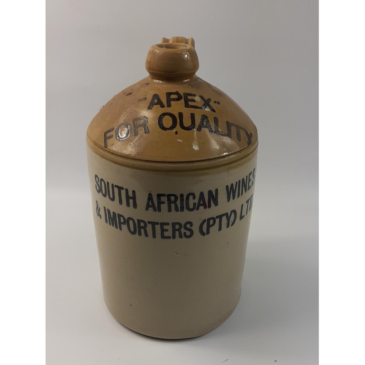 An interesting 1 gallon stoneware flagon by Govancroft of Glasgow standing 31cm tall, embossed SOUTH AFRICAN WINES & IMPORTERS (PVT) LTD and "APEX FOR QUALITY"