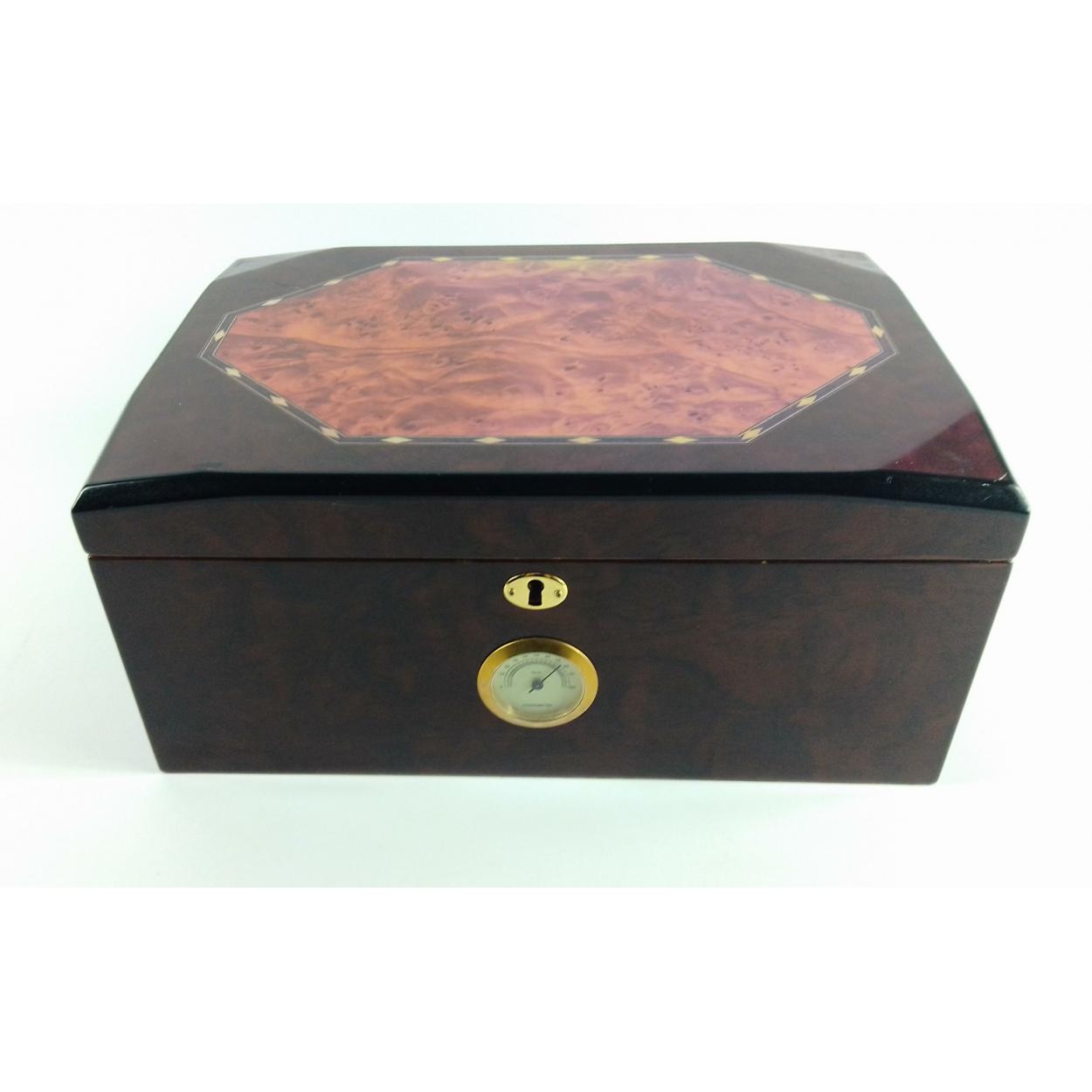 A HUMIDOR with hygrometer to front with lacquer finish and keys. Some fading to the lacquer finish. W34xH16xD24cm approx