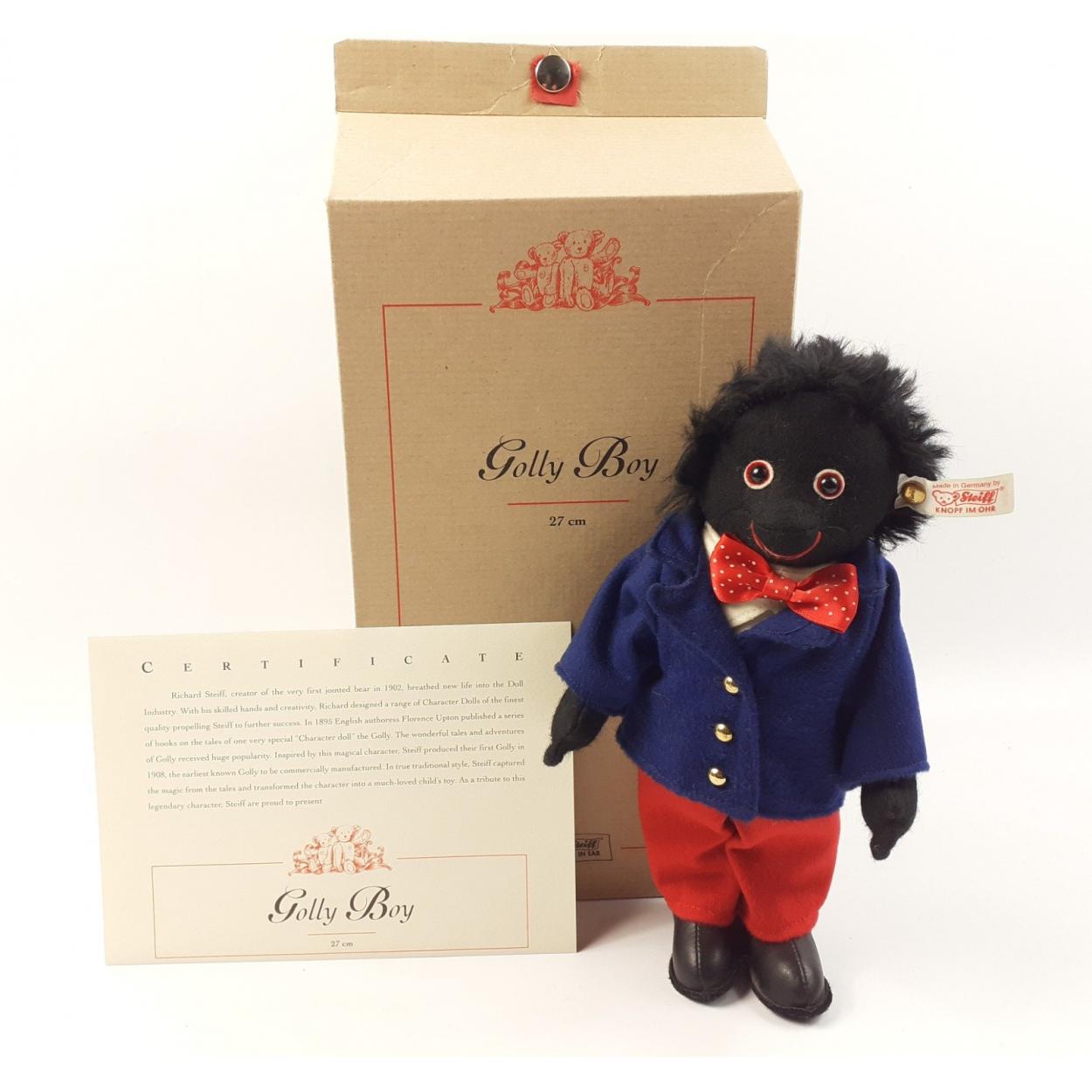 A STEIFF Golly Boy standing 27cm high with mohair, reference 660238, number 665 of a limited edition of 2000 produced in 2001. Comes in original box with certificates