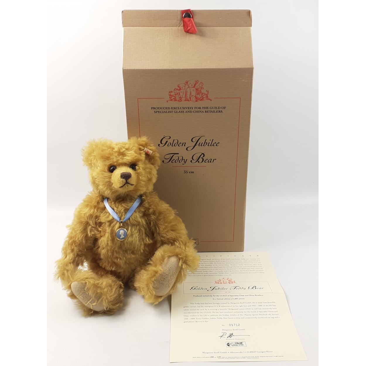 A STEIFF Golden Jubilee Bear with Wedgwood cameo of the queen necklace, reference 660610, stands 35cm high with mohair fur, number 01712 of a limited edition of 1500 produced in 2002 with certificate in original box