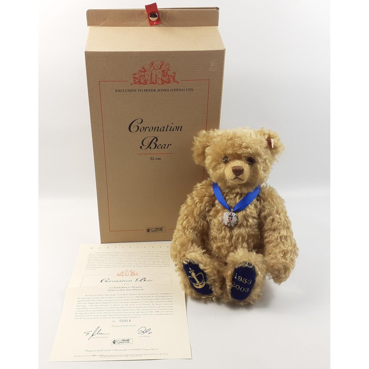 A STEIFF Coronation 1953-2003 growler bear with a ROYAL WORCESTER portrait of the queen on a ribbon, reference 660870, stands 35cm high, with mohair fun, limited edition of 1953 with certificate number 00914 in original box