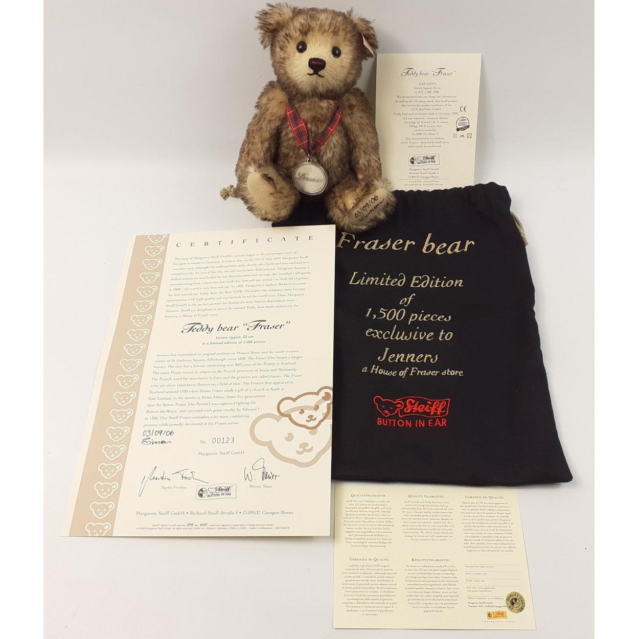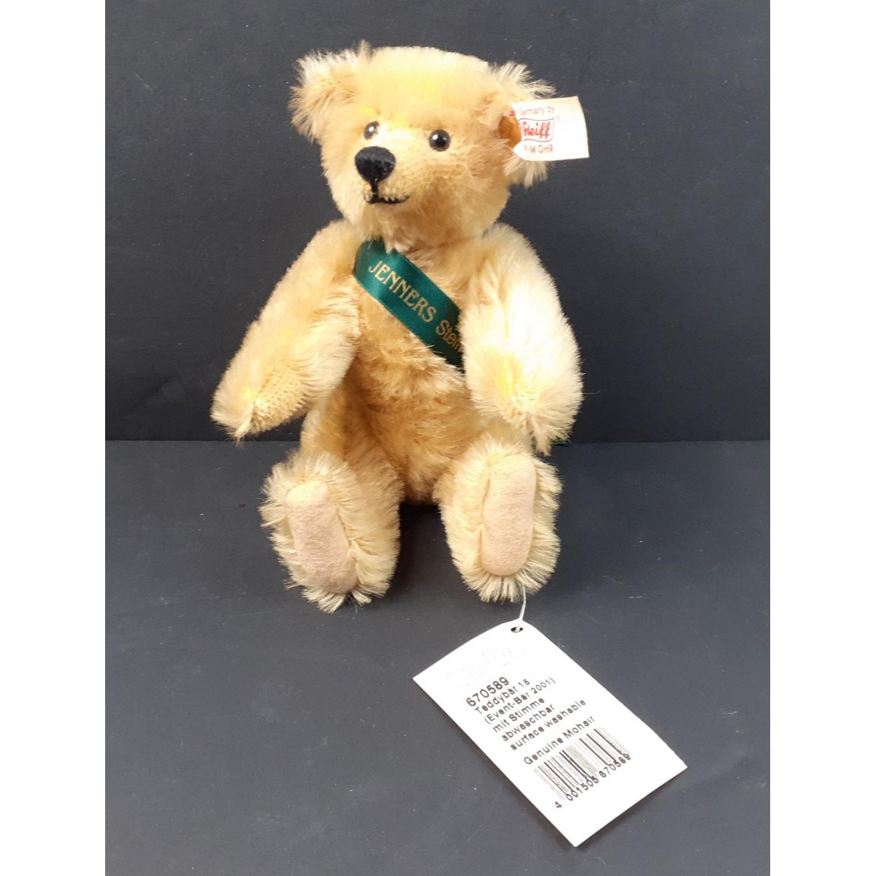 A STEIFF white event bear 2002 with JENNERS waistcoat, reference number 420337, stands 21cm tall, comes with certificate number 02210 in original box