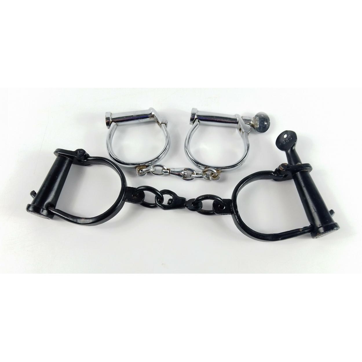 Two pairs of vintage handcuffs, both screw type, one stamped HIAT Best (67), the other unmarked