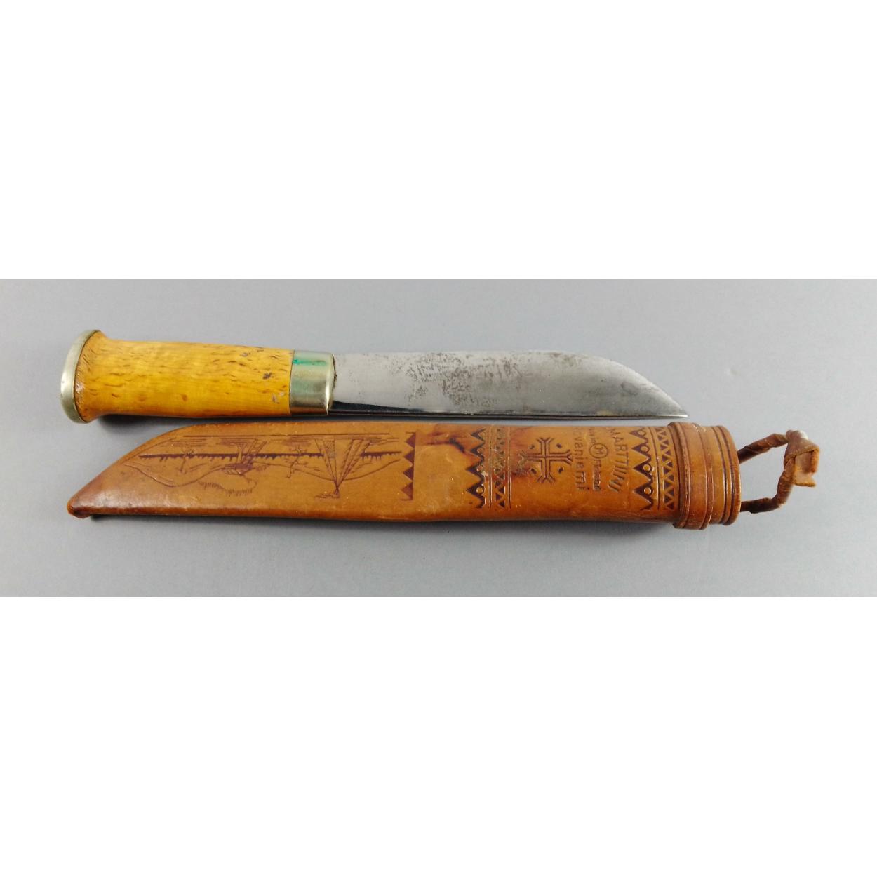 A hunting knife in sheath by MARTTIINI of Finland in decorated leather sheath, total length 26cm including handle