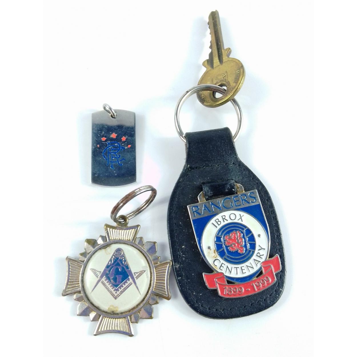 A small GLASGOW RANGERS lot comprising two keyrings and an additional Scottish Masonic keyring