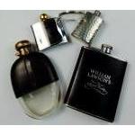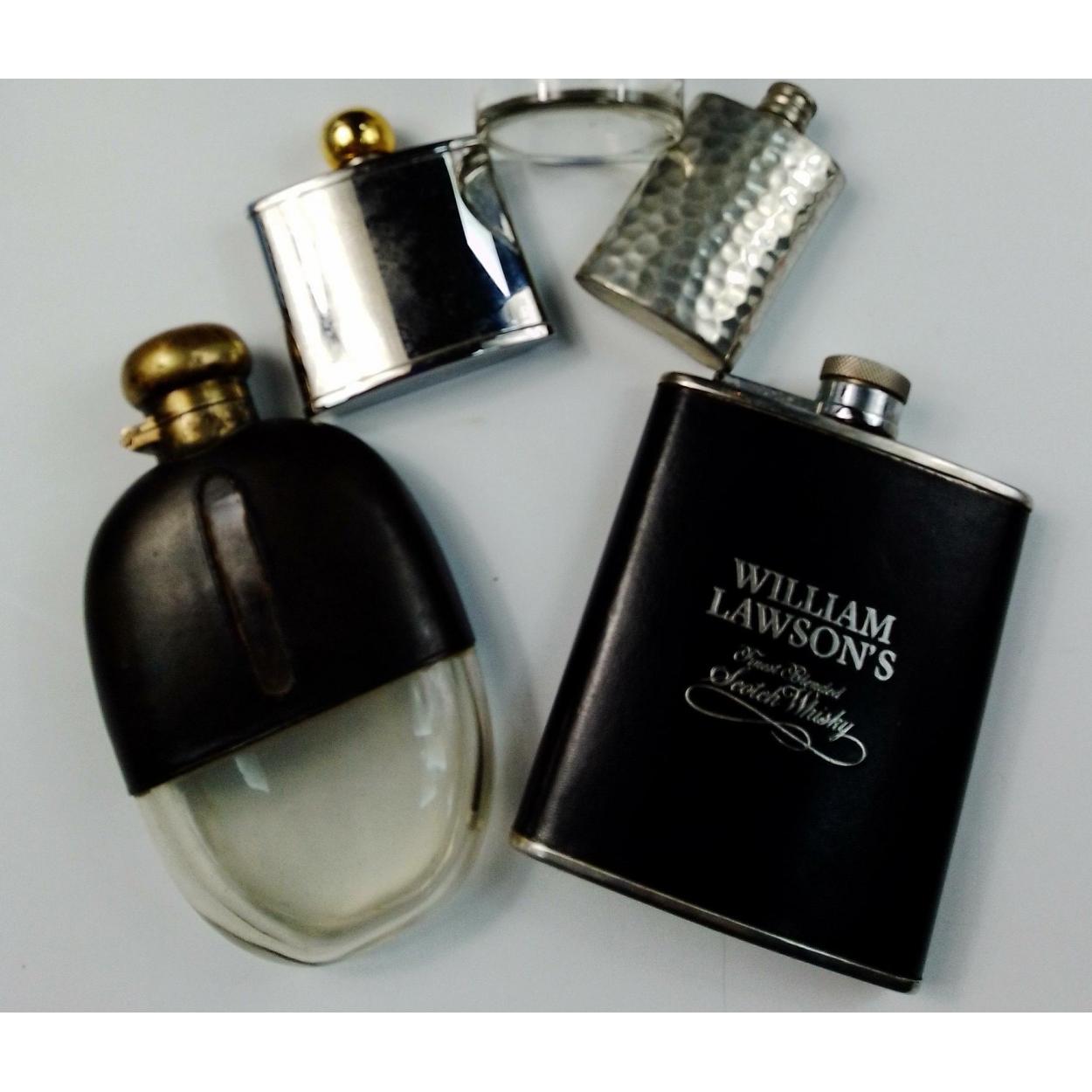A 1901 Glasgow International Exhibition tumbler and four whisky flasks including a leather clad antique one with brass twist cap fitting.