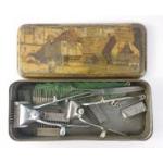 A tin containing a collection of old barber's haircutting pieces, clippers, combs etc.