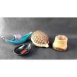 OF LOCAL INTEREST - hand-crafted works by local artisans to include a shot glass in wooden holder by PETER NORRIS of Cabbage Hall, Peebles, a salt dish and a gondola from MINIATURE POTTERY of Peebles, and a pottery hedgehog from TRAQUAIR,