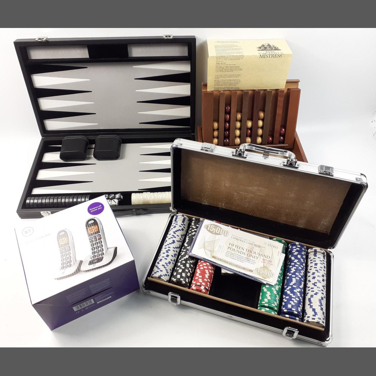 Be ready for the long winter nights away from the screen with a quality plush backgammon set, a poker set within a hardshell case, a quality wooden boxed set of the Captain's Mistress and an unused boxed BT4000 cordless telephone handset pair