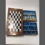 A wooden Oriental chess set with nicely detailed pieces in 2 drawers