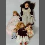 A super lot of five modern collectors DOLLS with china faces the largest standing 55cm tall. Includes four display stands.
