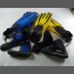 MARES AVANTI QUATTRO Open Heel Dive Fins – Yellow, size X-large MARES AVANTI QUATTRO Open Heel Dive Fins – Blue, size Small with Mens OCEANIC Dive Boots – Black, Size 11/L (45 EU) Ladies SAEKODIVE Dive Boots – Blue/Grey, Size 7/SM