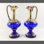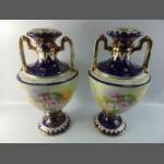 Two large twin-handled urns cobalt blue decorated with roses and gilt highlights, each stands approx 40cm tall, no maker's mark