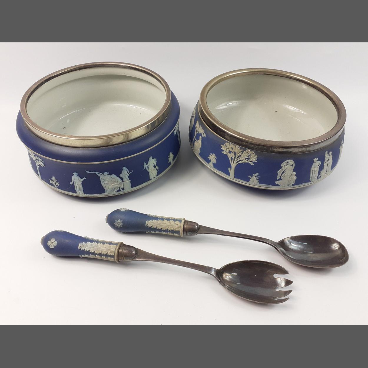 Two lovely matching WEDGWOOD jasperware salad bowls, each 20cm dia at aperture with 2 servers