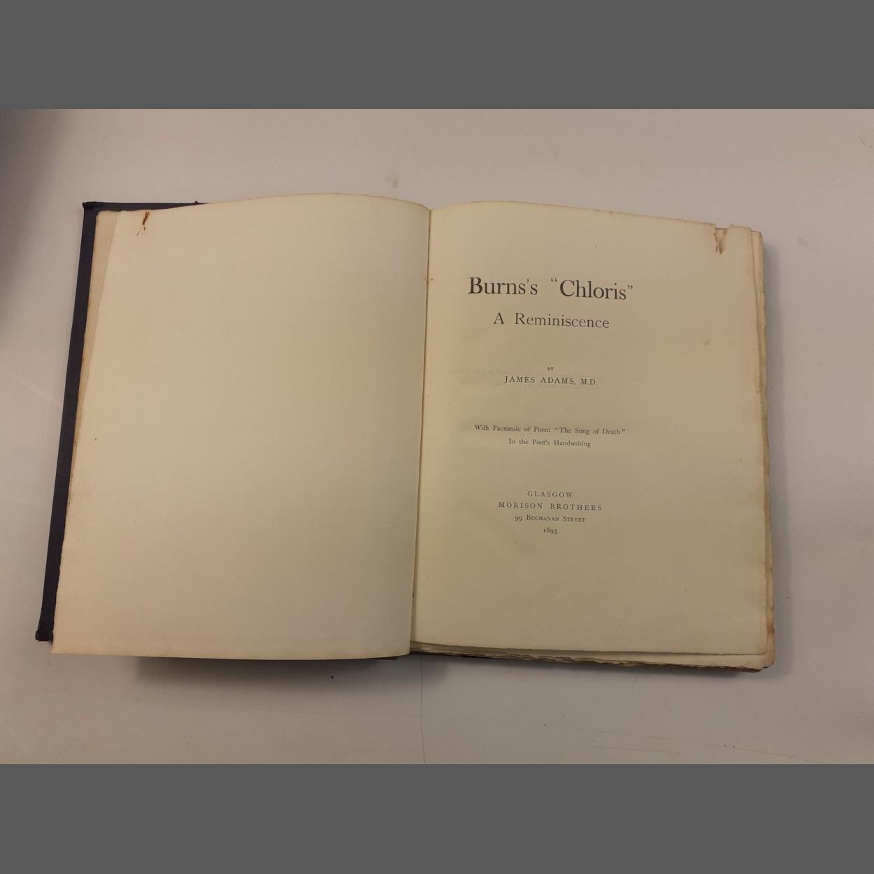 A limited edition of BURNS'S CHLORIS: A REMINISCENCE by JAMES ADAMS. A limited edition of 275 large paper copies of which 250 were offered for sale. Dark blue cloth with vellum spine with unclear red lettering on spine. Slight tear on title page, hand-cut pages.