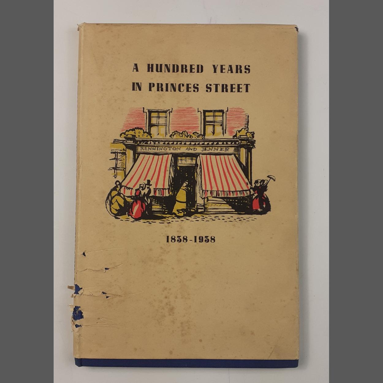 A HUNDRED YEARS OF PRINCES STREET 1838 - 1938 produced by JENNERS on the occasion of their 100th anniversary in 1938. Written by Mary G Grierson. Comes with compliment slip from the directors of Jenners. Some damage to dust jacket, all pages intact, some foxing, hand-cut pages. Lovely piece of Edinburgh history