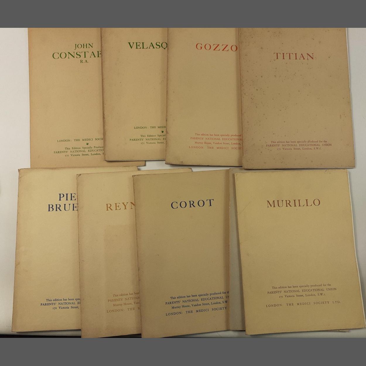 The life and work of various outstanding artists presented as colour plates in cord binding produced by The Medici Society Ltd / Parents National Educational Union, London in the 1950s. Artists include JOHN CONSTABLE English School, MURILLO Spanish School, DURER German School, TITIAN Venetian School, GOZZOLI Florentine School, VELASQUEZ Spanish School, FRANS HALS Dutch School, PIETER BRUEGHEL Flemish School, REYNOLDS British School and COROT French School. These books are presented with six colour plates of each artist's work and are in generally good condition